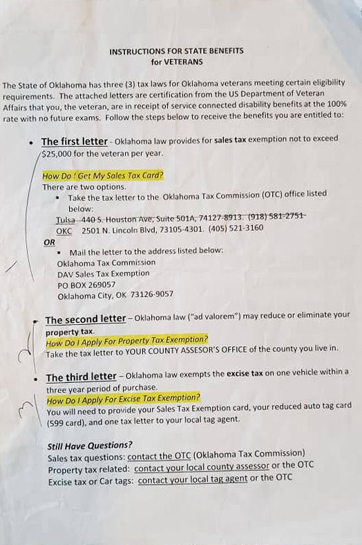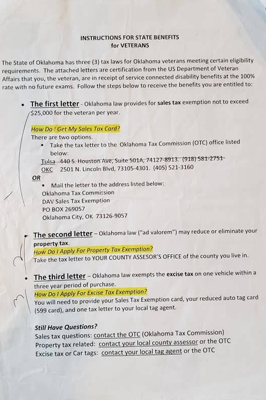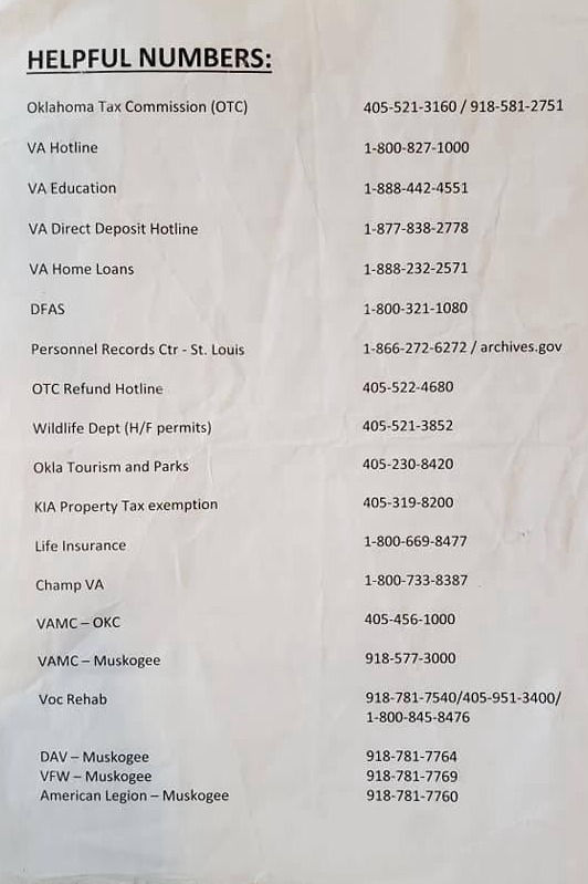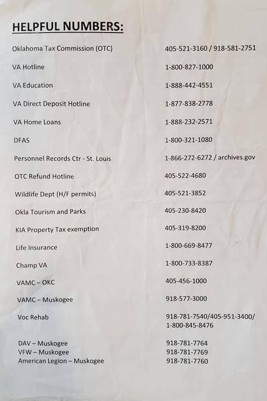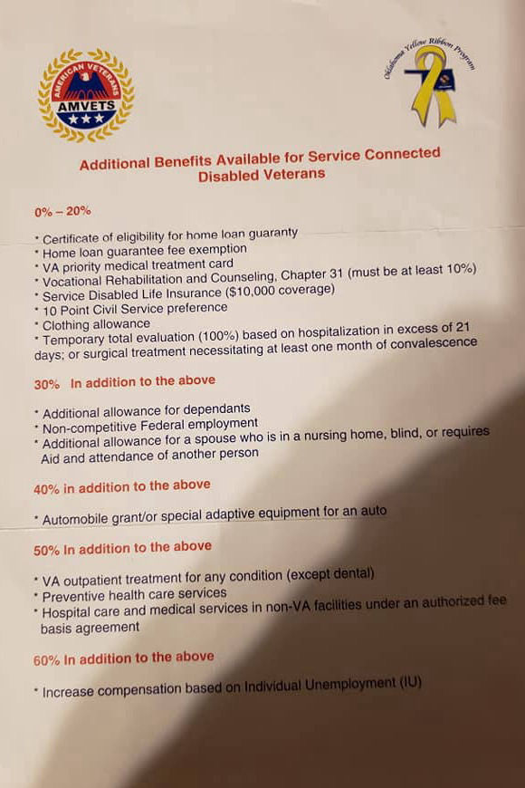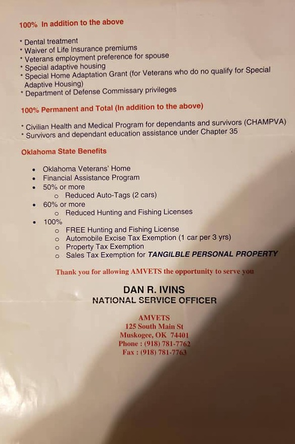 Attention Soldiers: This list shows the VA disability ratings and the benefits according to each disability percentage. The other papers are important phone numbers for veterans including the tax exempt procedures for veterans who are 100 percent VA disabled AND unemployable in Oklahoma. Every state has different benefits for veterans. What is my mission as a Veteran Service Officer for VFW Post 539 in Henryetta, Oklahoma? My mission is to educate soldiers, veterans, and their dependents on their benefits and help them by completing their military